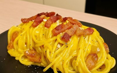 Découvrez la véritable Spaghetti à la Carbonara italienne 🇮🇹 : sans crème, sans ail, sans oignon ! Juste le parfait équilibre entre guanciale croustillant, Pecorino…
