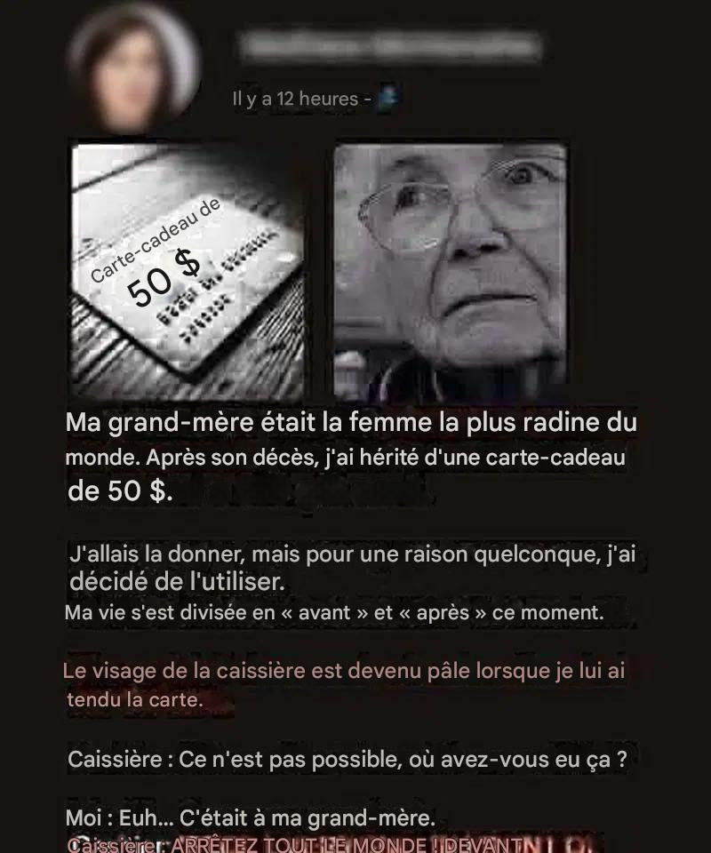 J’avais toujours considéré Grand-mère comme la femme la plus avare qui soit. Après ses funérailles, j’ai trouvé la carte-cadeau parmi ses affaires. Au départ, j’ai failli la donner, la jugeant insignifiante. Mais un après-midi tranquille, la curiosité l’a emporté et je l’ai tendue à une caissière.