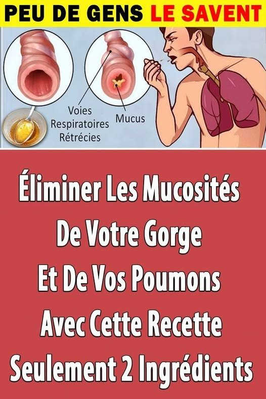 Les mucosités dans la gorge et les poumons peuvent être très inconfortables, causant toux, congestion et difficultés à respirer. Heureusement, il existe une solution naturelle simple et efficace pour les éliminer rapidement. Avec seulement deux ingrédients, cette recette maison vous aidera à dégager vos voies respiratoires et à retrouver une respiration aisée.