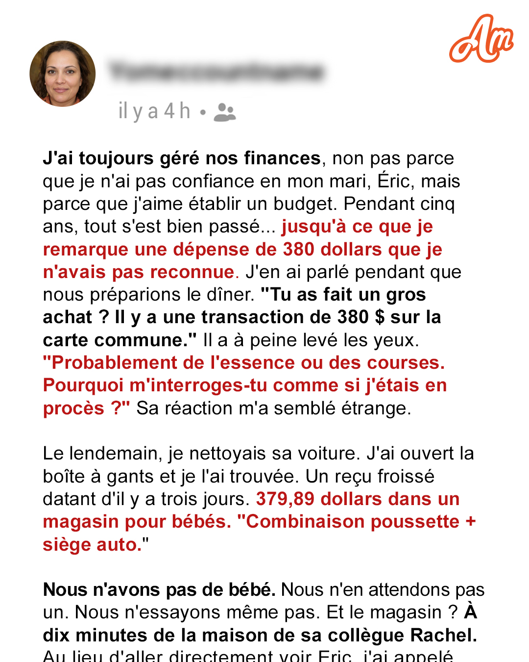 Le budget, c'est mon truc, et c'est pourquoi je fais le suivi de toutes les transactions du ménage. Alors, quand mon mari m'a reproché de poser des questions sur une dépense, j'ai commencé à être curieuse. Lorsque j'ai trouvé un reçu de 380 $ pour une poussette de bébé dans sa voiture, j'ai arrêté de poser des questions et j'ai commencé à relier les points… parce que nous n'avons pas de bébé.