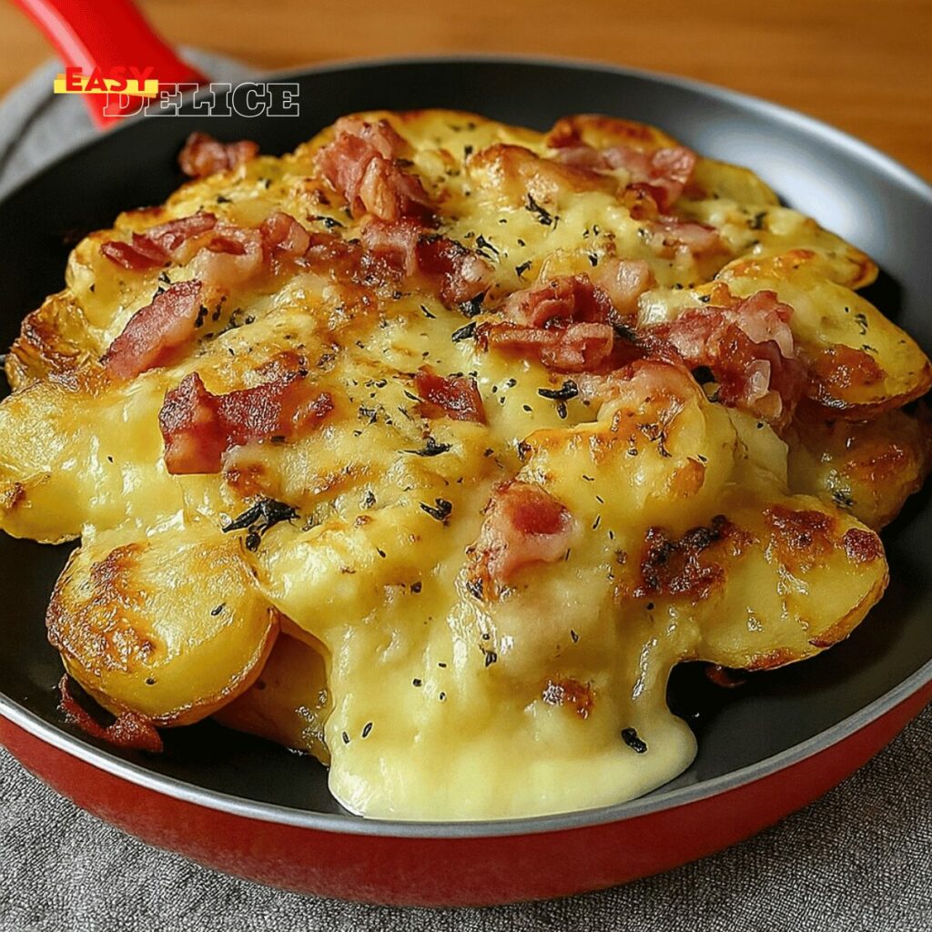Serre immédiatement, directement dans la poêle, pour profiter de tout le fondant du fromage et du croustillant du lard.
