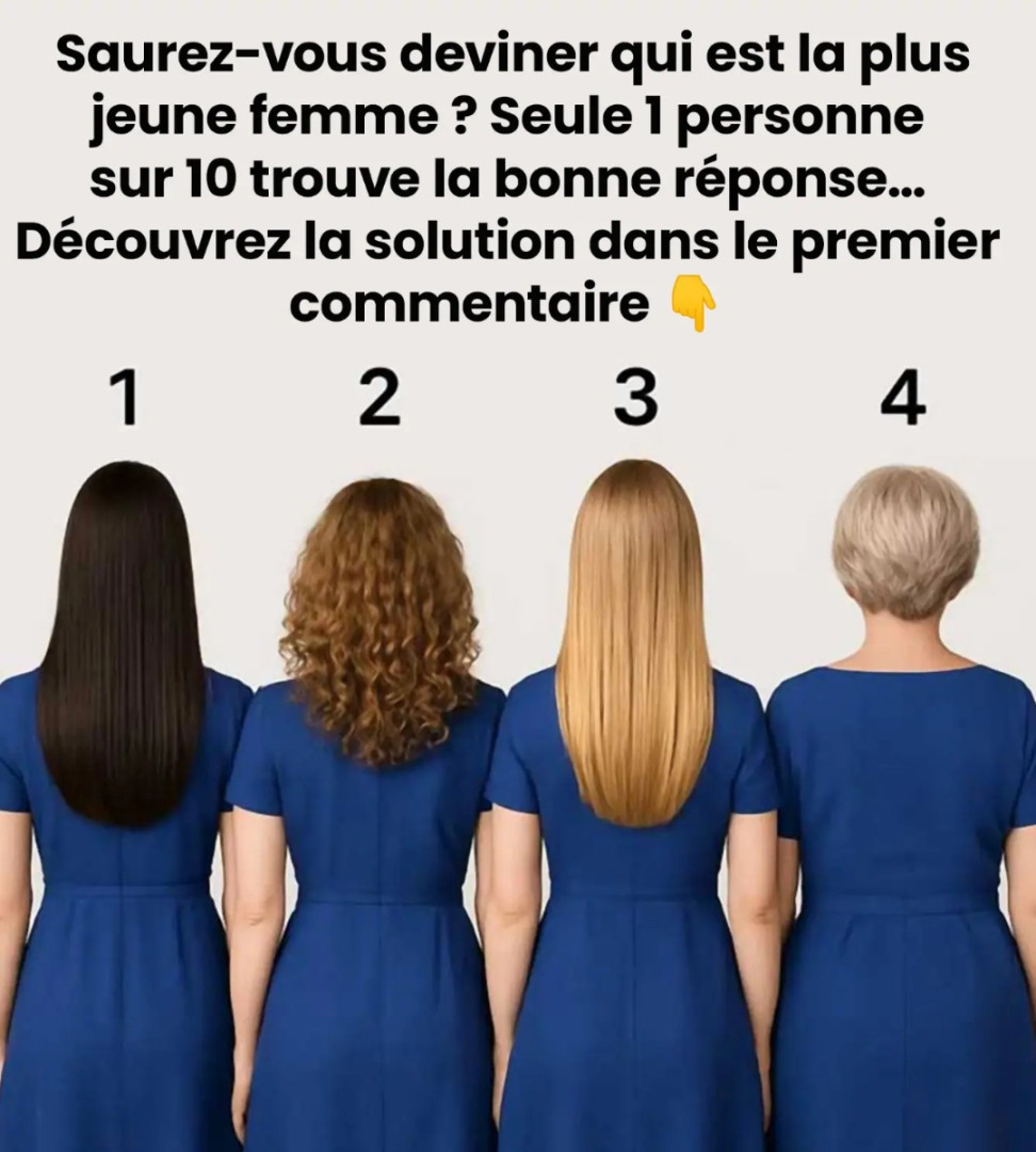 Quatre femmes, quatre dos tournés, quatre chevelures bien différentes… et une seule question : qui est la plus jeune ? Si cela semble facile au premier regard, méfiez-vous des apparences. Cette devinette visuelle, devenue virale sur les réseaux sociaux, met à l’épreuve votre capacité à observer les détails les plus subtils.