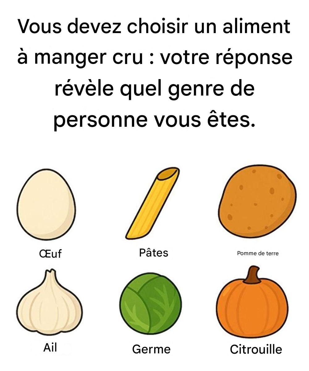 Parfois, les questions les plus simples révèlent les vérités les plus surprenantes. Imaginez que vous deviez choisir un de ces aliments à manger cru : œuf, pâtes, pomme de terre, ail, germe ou potiron.